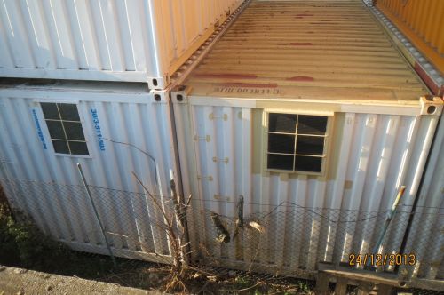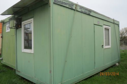 Újszerű, 20 lábas iroda. 1 db. Eredetileg egymásra téve álltak egy fedett csarnokban, a megrendelő egyedi kívánsága alapján lett készítve. Értsd: erősített, fokozottan hőszigetelt kivitel, több lámpával, kimonodottan világosra.