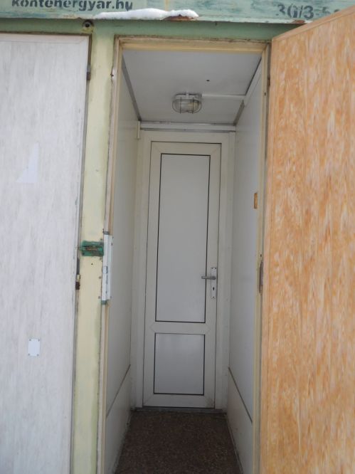 Női-ffi WC, mosdó, zuhanyzó konténer. Kimondottan erőss kivitelű, új aljzattal, csak a lakkszerű gyantaréteget kell felhordani. /raktáron pihen/ Nagy igénybevételű - forgalmú helyre kiváló. A két külső WC nagyon praktikus. OLdalt új ablakok, felújítás befejezés előtt áll, a levett két ajtó a konténerben pihen.